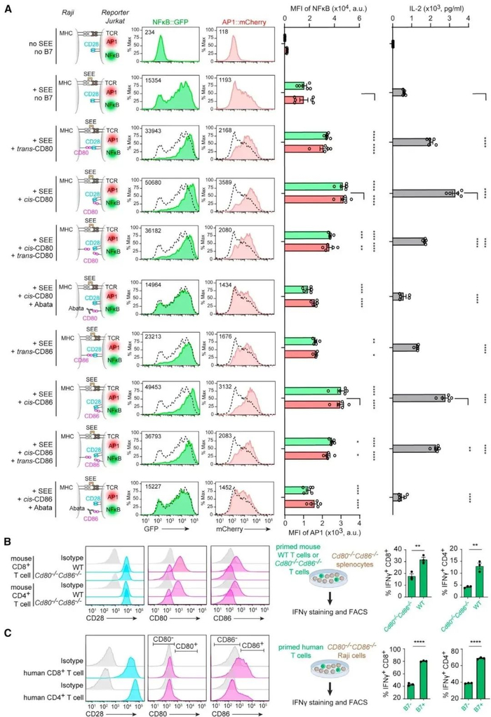 研究人员构建稳定表达CD80和CD86或两者都不表达的Jurkat株系和Raji APCs,实现B7顺式、反式或两者都向CD28呈递的共培养条件。不含B7条件下,SEE刺激TCR表达NFkB、AP1和IL-2信号。在Raji细胞上表达B7,即提供反式B7:CD28作用,三种信号会增加。在Jurkat细胞上表达B7,即提供顺式B7:CD28作用,同样会增加三种信号。与顺式B7单独存在相比,顺式B7和反式B7共存会降低三种信号,表明反式B7和顺式B7会竞争CD28。研究证实cis-B7:CD28相互作用促进T细胞中NFkB、AP1和IL-2的表达。并通过B7缺陷T细胞数据表明,B7表达可增强T细胞产生IFNγ。