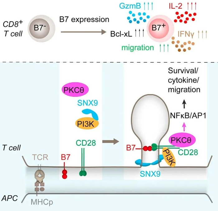 抗原递呈细胞(APC)表达的B7配体(CD80和CD86)反式激活T细胞上的主要共刺激受体CD28。然而,在外周组织中,表达B7配体的APC相对较少。因此外周组织中是否也会发生CD28共刺激呢?具体的机制是什么?本文中报告了CD8+T细胞自身表达B7配体,在免疫突触的膜内翻结构中与CD28产生顺式相互作用,是由PI3K-SNX9信号轴驱动的膜重塑结果。顺式B7:CD28相互作用,通过蛋白激酶激活CD28信号传导,促进CD8+T细胞存活、迁移和细胞因子的产生。在小鼠肿瘤模型中,T细胞内在顺式B7:CD28相互作用的缺失会减少瘤内T细胞并加速肿瘤生长。研究表明,T细胞可以通过一种之前未被描述的免疫细胞自体信号给予的新机制,在外周组织中自我激活并增强其抗肿瘤能力。