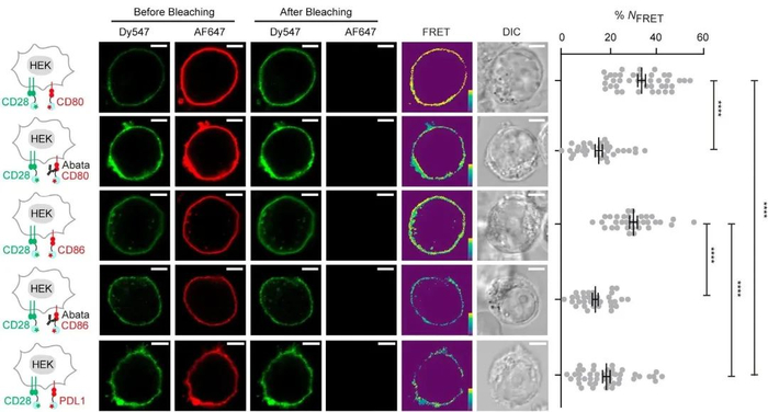 abatacept能够抑制顺式和反式B7:CD28作用,说明顺式和反式B7与CD28结合位点相同,并以“头对头”的方式结合。头对头顺式结合需要蛋白质弯曲或膜内陷,后者会使相互作用蛋白质的胞内结构域(ICD)相距更远。本研究通过分析B7 ICD和CD28 ICD之间的FRET进行验证,发现当B7和CD28顺式作用时,它们的ICD位于远端,而外结构域(ECD)位于近端,这与头对头结合一致。双分子发光互补(BiLC)的研究结果与FRET一致。