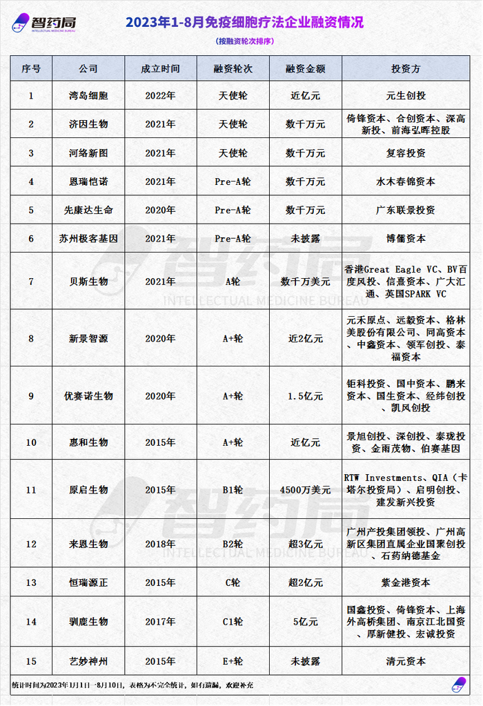 智药局根据公开信息统计,2023年1月至8月10日,共有15家企业完成新一轮融资,总金额超19.2亿元。