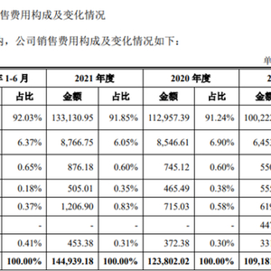 销售费用成为影响公司利润的主要部分。报告期内,公司销售费用依次为10.91亿、12.38亿、14.49亿、5.91亿,占当期营业收入比例分别为75.57%、72.77%、73.47%、72.23%;同行可比公司销售费用率的平均值依次为60.96%、60.09%、60.07%、54.62%。
