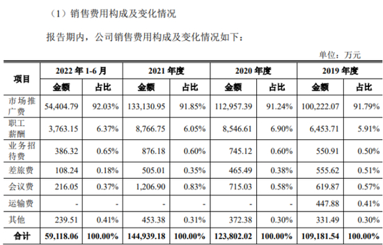 在招股书对市场推广费主要内容的介绍中,有拜访临床目标医生、学术文章推广、商业渠道维护、商业数据收集、商业采购预测、终端渠道开发、终端渠道维护等,公司还策划、组织、执行面向多人的产品宣讲活动,包括但不限于邀请与会人员、布置会议场地、制作会议材料,通过学术会议介绍宣传公司产品疗效,加深医疗机构人员对公司产品的认可度,提升公司影响力。