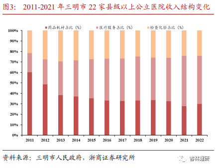 腾笼换鸟,稳收入、调结构是关键。在医保压力持续加大的基础上,改革的关键是调整医院收入结构。2022年三明市22家公立医院总收入达到38.62亿元(YOY-0.07%),不含体检收入的医药收入为37.84亿元(YOY+ 0.35%)。与2001-2011年公立医院收入的复合增长率相比较,三明市医院收入总额得到明显控制。控制总量与支付比例是完善医保支付能力的重要举措,调整收入结构是“医药”、“医保”、“医疗”,三医共赢的基础。