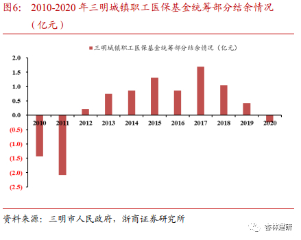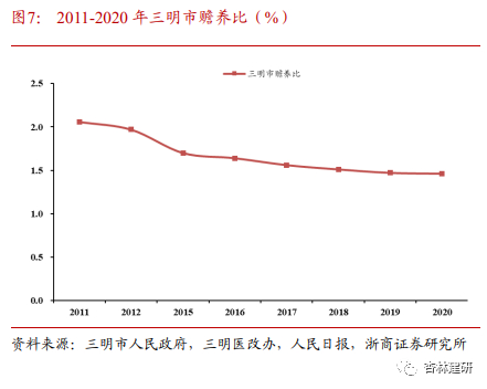 医保:①医保基金在赡养比持续下降下扭亏并保持稳定结余:根据三明市健康委员会、三明医改办、人民日报披露信息,三明市城镇职工赡养比从2011年的2.06下降至2020年的1.46,而医保基金从2012年起始终保持结余状态(其中2020受外部影响减半征收1.2亿元)。