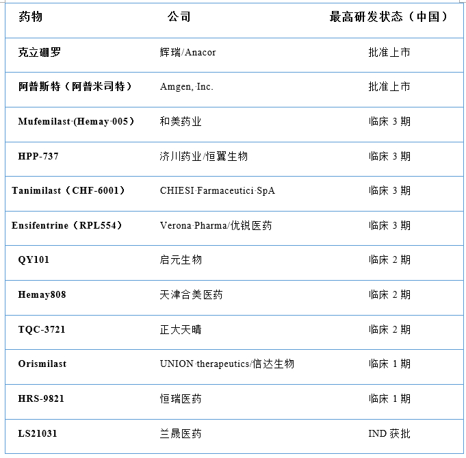 国内目前上市,PDE4抑制剂主要包括:辉瑞的克立硼罗和安进的阿普米司特。而目前在研进入临床的PDE4抑制剂约有11种,其中包括恒瑞的HRS-9821(临床1期)和正大天晴的TQC-3721(临床2期)等。