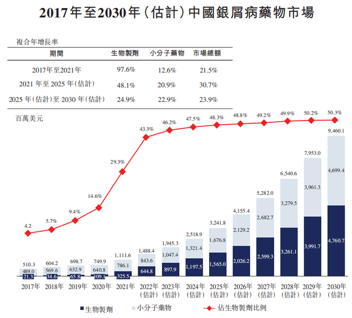 根据弗若斯特沙利文的资料,2021年中国银屑病的患病人数为670万人,预计于2030年将达到690万,其中20%至30%的患者为中重度银屑病。2021年,中国的银屑病药物市场规模为11亿美元,预计于2030年将增长至95亿美元,复合年增长率为27.1%。其中,生物药2021年市场占有率为29.3%,随着国内庞大的患者群体和临床治疗需求,以及新药的不断进入,估计于2030年将上升至50.3%,市场前景广阔。