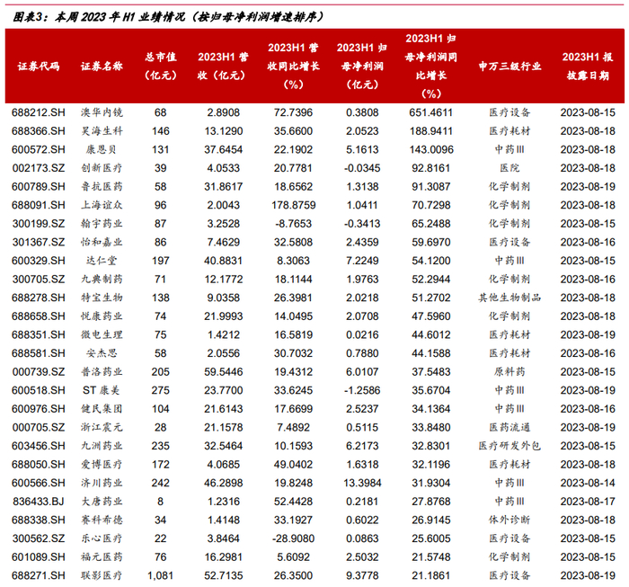 本周SW医药共有59家企业披露2023年中报业绩。净利润呈现正增长有40家,其中净利润增速>100%为3家,50%<增速≤100%为8家,0%<增速≤50%为29家。净利润呈现负增长有19家,其中-50%<净利润增速≤0%为10家,-100%<增速≤-50%为7家,增速≤-100%为2家。