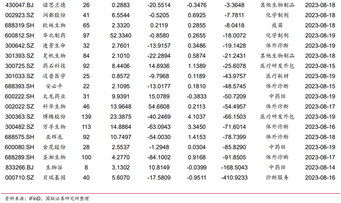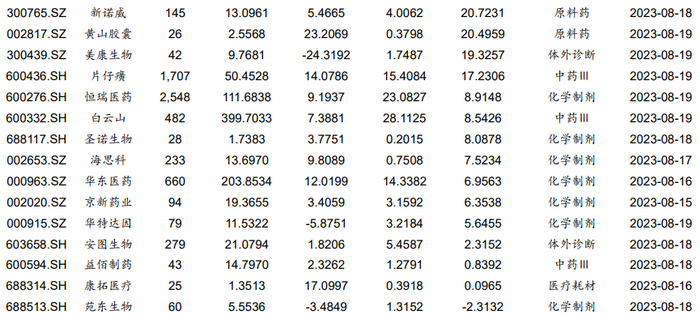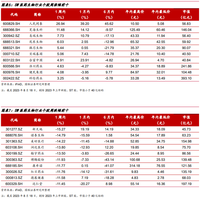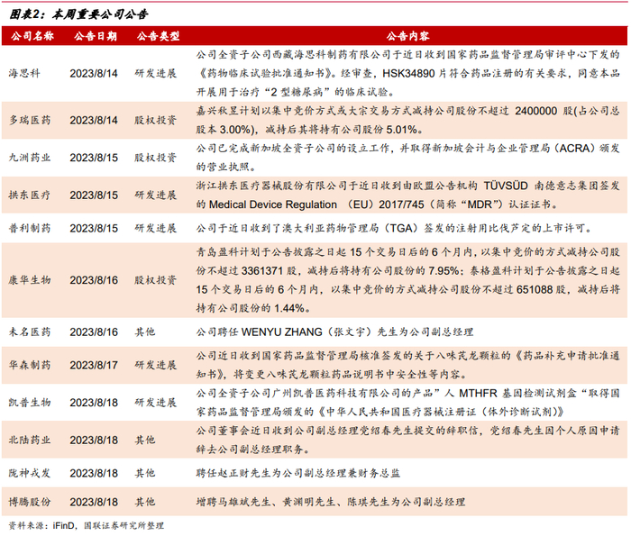个股方面,化学制药子行业的微芯生物(+5.44%,括号中为本周涨幅,下同)、科伦药业(+3.25%)、艾力斯(+2.05%)和恒瑞医药(+1.91%)涨幅较好。微芯生物中报归母净利润大幅上涨。恒瑞医药中报业绩止跌回升,创新药收入近50亿元。科伦药业持股的科伦博泰Trop-2 ADC产品SKB264治疗三线及以上的局部晚期、复发或转移性三阴性乳腺癌患者的III期临床试验达到主要研究终点。艾力斯也在2023世界肺癌大会(WCLC)上披露了伏美替尼针对EGFR20外显子插入非小细胞肺癌的Ib期积极临床数据。