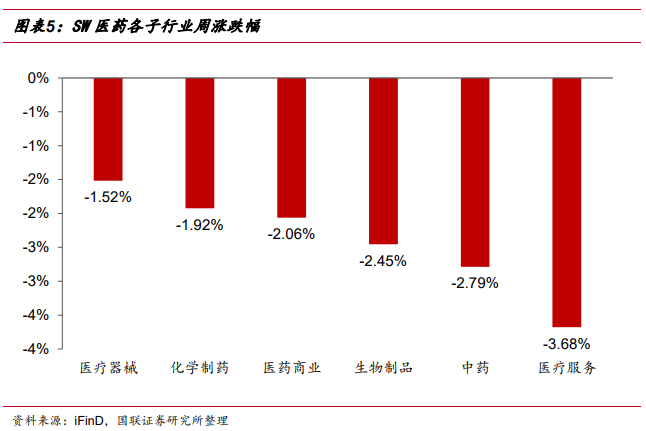 本周医药器械子行业跌幅最小。本周医疗器械子行业下跌1.52%,化学制药子行业下跌1.92%,医药商业子行业下跌2.06%,生物制品子行业下跌2.45%,中药子行业下跌2.79%,医疗服务子行业下跌3.68%。