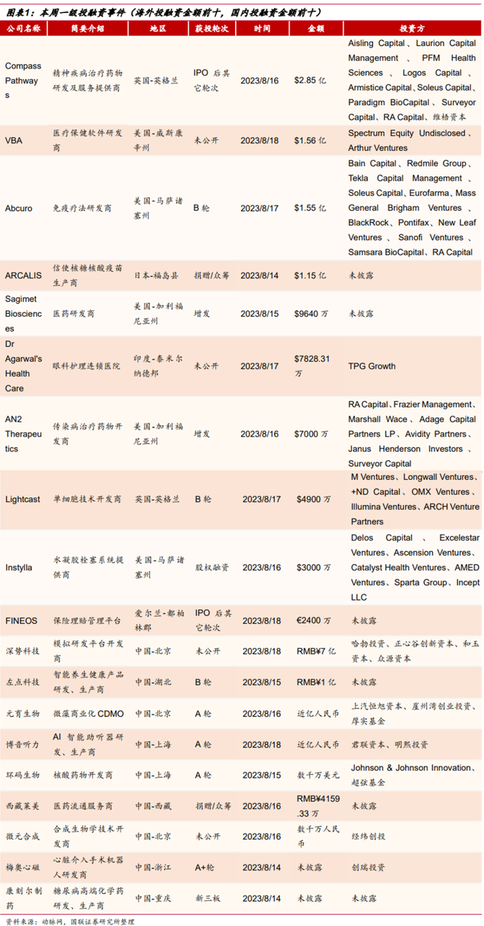 本周海内外一级投融资聚焦于医疗保健、药物研发、医疗技术研发。此外,医疗器械、CDMO等方向也是本周国内投融资热点。