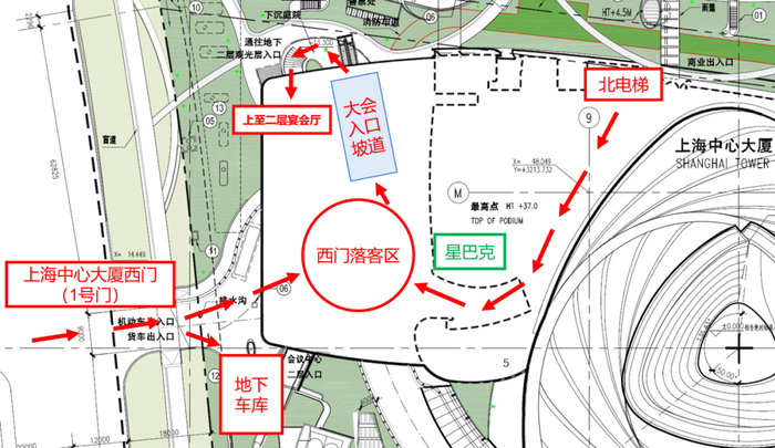 到达上海中心大厦西门(1号门)落客区——抵达大会入口