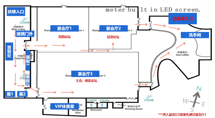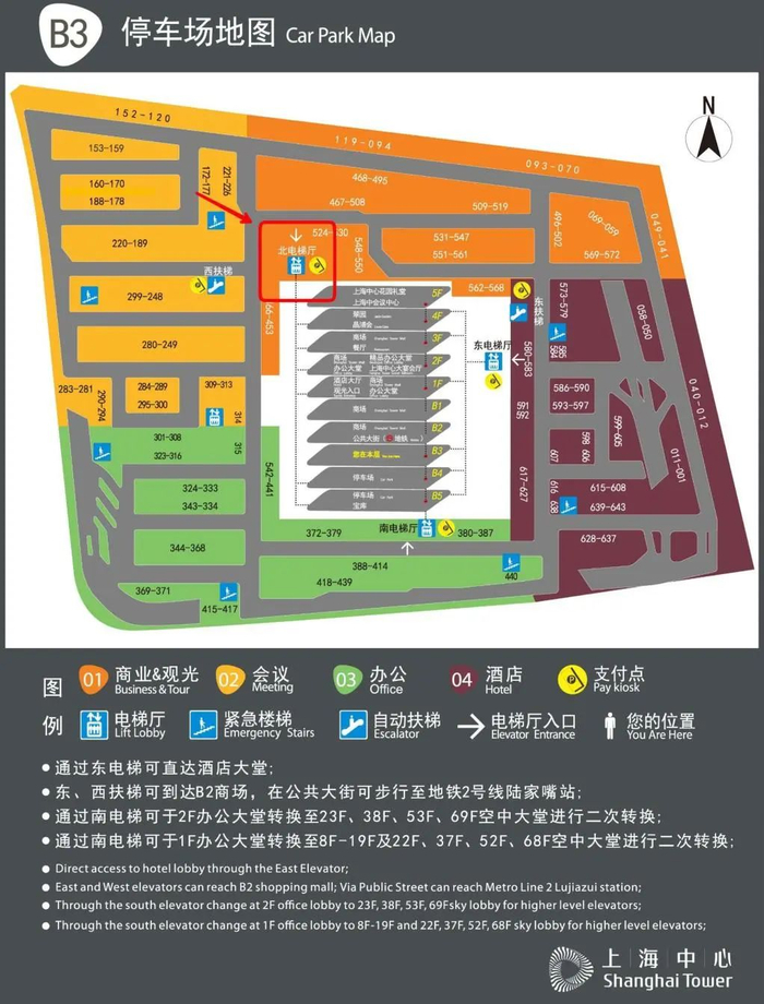 抵达上海中心大厦西门(1号门)停车场——乘坐北电梯(位于黄色和橙色停车区域交界处)——上至1层——根据电梯出口指引牌指示向西行50米——到达西门落客区——抵达大会入口