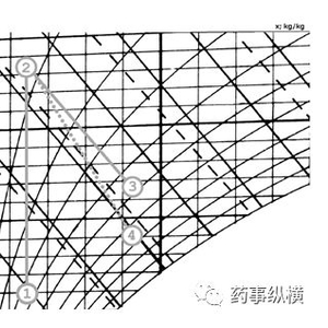 将湿空气各种参数之间的关系用图线表示,制成焓湿图,应用方便,图1 左为空气的湿焓图,线条代表意义图中有所标示,对于理解流化床操作过程有重要意义,图1右表示流化床操作状态点过程,从①到②表示进气空气加热加热过程,如刚才所说的将5℃的冷空气加热到50℃,该过程可以看作为一个等湿加热过程,温度升高,绝对湿度不变,但相对温度降低;从②到③表示加热后热空气与湿物料的一个湿热交换过程,空气遇湿物料蒸发吸热,温度降低,湿度升高的过程;从②到④与②到③是相同过程,只不过②到③看作为一个绝热过程,②到④为非绝热过程,与外环境有一个热量的交换。