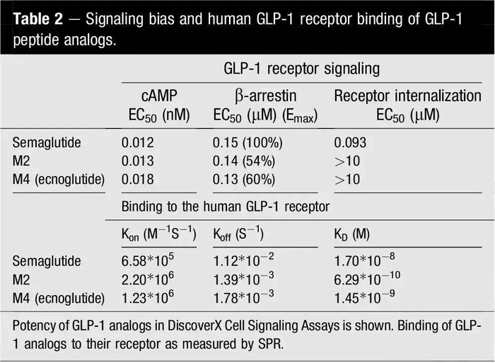 结果显示GLP-1肽类似物(M2和M4)与人GLP-1R重组蛋白的结合亲和力比GLP-1R激动剂(Semaglutide)的高10-30倍。(doi: 10.1016/j.molmet.2023.101762)