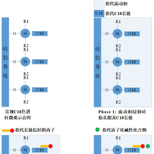需指出,离子对试剂中亲脂的疏水端与C18长链的“吸附”往往是不可逆的,也就是说离子对试剂对色谱柱的改性难以避免的。“专柱专用”是避免离子对色谱法难以重现的有效办法。