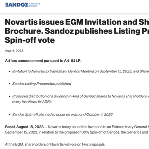 药融云数据www.pharnexcloud.com监测显示:诺华制药(Novartis)近期宣布,将于2023年9月15日召开特别股东大会,讨论剥离旗下Sandoz(山德士)的相关事宜。诺华制药董事会已经批准了该提议,分拆计划预计将在今年10月4日左右进行,瑞士证券交易所上市。未来也将托管凭证ADR的形式同时在美股上市。