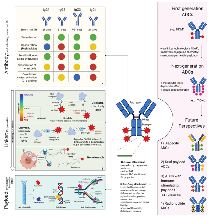 抗体-药物偶联物(ADC)被称为癌症治疗的“魔法子弹”,因为它们结合了抗体部分的肿瘤靶向特性和细胞毒性药物的效力。ADC是由三个关键成分组成的复合治疗剂:抗体、连接子和有效载荷[1],对这些成分进行优化可以产生更好的ADC(图1)。