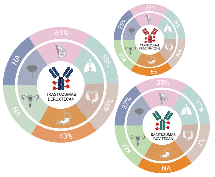 实体瘤为ADC的发展提供了广阔的机会,因为它们比血液系统恶性肿瘤更常见,晚期或转移性疾病的治疗选择相对较少,而且目前免疫疗法有治愈患者的潜力的疾病很少。因此,ADC治疗多种实体瘤类型的潜力对于治疗那些不表达HER2的肿瘤具有重要意义(图3)。在这方面,2019年批准针对NECTIN-4的Enfortumab vedotin用于治疗局部晚期或转移性尿路上皮恶性肿瘤,以及针对TROP2的Sacituzumab govitecan用于治疗三阴性乳腺癌,这两种药物特别有意义,因为为可选治疗方案有限的疾病提供了可选治疗方案[12]。