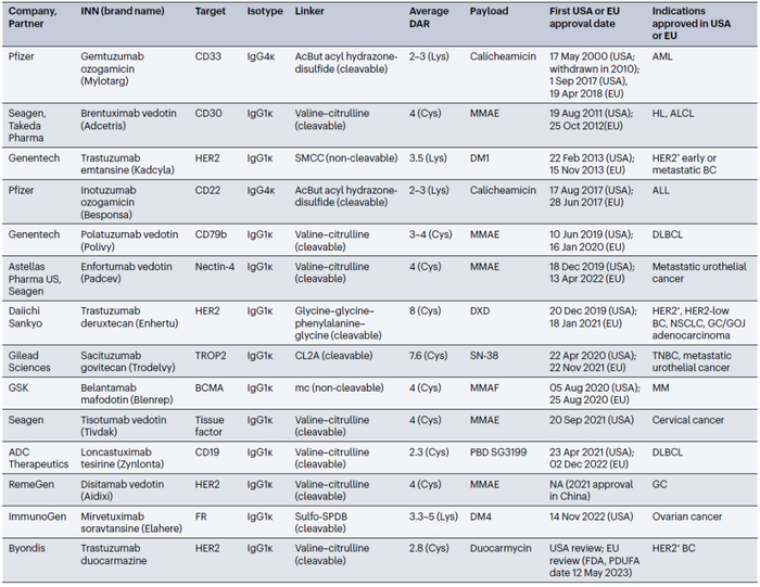 图2. 经批准的ADC的主要特性。