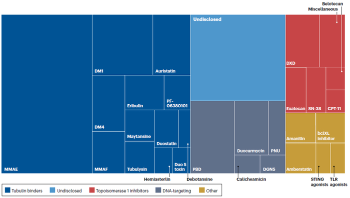 图4. ADC管线中的有效载荷多样性:微管蛋白结合剂(深蓝色)、拓扑异构酶1抑制剂(红色)和DNA靶向剂(灰色),以及数量有限的杂项化合物(黄色)
