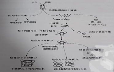 顶喷制粒工艺是由一个锥形的物料槽即扩散(喷雾)室等部件组成,干燥的高温气流由物料槽底部穿过气流分布板、筛网进入物料层,当干燥的高温气流的流速高于物料受到的重力引力,就可使物料槽的物料随干燥的高温气流流动,同时与干燥的高温气流进行热交换从而蒸发掉物料中的水分,达到干燥的目的,当气流逐渐向上进行扩散时,气流产生的喷动力将逐渐减弱,物料在被空气吹起的阶段,每个粒子的表面完全展现在空气中,因此可得到最佳的雾化喷液介质吸附和干燥结果。在物料的重力大于喷动力时,物料会从新落回物料槽中,如此不断地循环就产生了流化态。用流化床顶喷装置进行制粒时,粉末或粒子从物料槽的上升呈流化状态,粘合剂液体通过安装在扩散(喷雾)室的雾化器喷嘴喷入流化床,对物料进行制粒,并通过底部进入的热气流和被加热的气流分布板进行热交换,对物料进行干燥,制粒的目标是用十分精细的粉末生产无尘、流动性好的微小团聚颗粒。粒子的形成机制及接下来的生长过程主要经过三个阶段:①成核过程;②转换过程;③粒子长大的过程。流化床制粒的生长机制见下图。