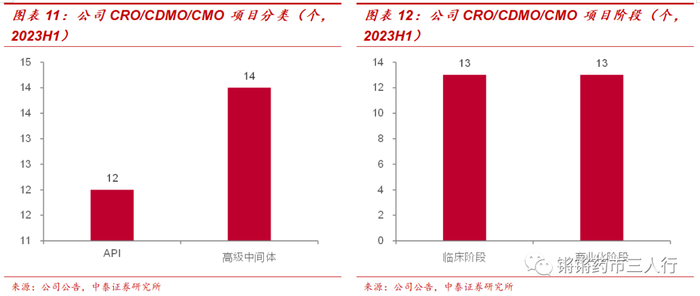 ■ CRO/CDMO:公司持续加大CRO/CDMO的投入力度,不断扩充研发团队规模,现已建立一支由博士、硕士等各学历层次组成的200多人的研究分析开发团队,并不断引进国内外优秀人才加盟,持续增强核心竞争力。项目数量上,公司上半年进行中的CRO/CDMO/CMO业务项目总数26个(CRO/CDMO项目15个、CMO项目11个),其中API项目12个,高级中间体项目14个,分布在不同的阶段,其中临床阶段的项目13个,商业化阶段的项目13个。