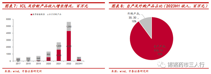 ■分业务来看:公司2023年上半年实现第三方医学实验室检验服务收入2.55亿元,同比下降88.43%;分子诊断产品实现收入3.51亿元,同比下降44.85%,其中自产产品实现销售收入3.16亿元,外购产品实现收入0.35亿元。