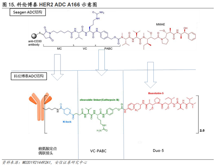 科伦博泰的既往的ADC技术主要是基于已过专利期的Seagen的ADC技术路线进行优化改造所得,其优化改造主要针对接头部分,目前已有HER2 ADC A166进入NDA阶段,据科伦博泰已披露的相关文献专利: