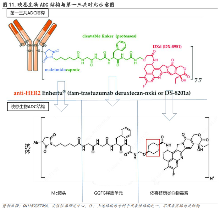 根据映恩生物ADC专利,映恩生物的ADC技术仅仅针对第一三共技术平台中毒素Dxd进行改造优化,技术平台确定性高,有望最大程度保留有效性。对比来看映恩生物ADC与第一三共DXd系列ADC药物具有较为相似的结构:
