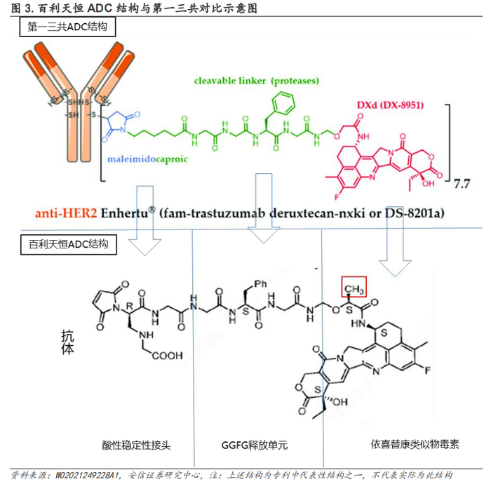 3)payload均为依喜替康类似物,区别仅在于百利天恒在Dxd酰胺α位引入一个基团(例如甲基)。