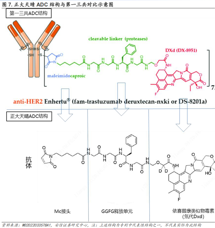 第一三共目前已基于其ADC平台开发出了HER2、TROP2、HER3等不同靶点的ADC药物,其ADC主要结构大致可分为“抗体-(Mc-GGFG-Dxd)n”结构,其中: