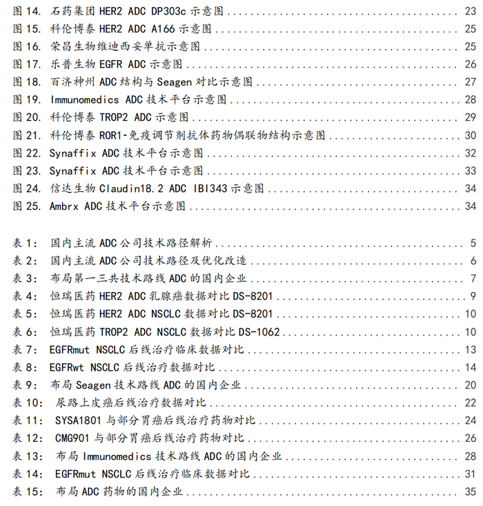 ■国内主流的ADC技术主要是基于第一三共、Seagen、Immunomedics等平台优化改造而来。从技术路线来看,主流的国产ADC技术主要是基于第一三共、Seagen、Immunomedics、Synaffix、Ambrx等技术平台进行的优化改造或者引进产品或技术所得。目前全球有多家药企布局ADC领域,包括第一三共、Seagen、Immunomedics、Ambrx、Synaffix、ADC Therapeutisc、ImmunoGen、Mersana、NBE Therapeutics、Zymeworks、Alteogen等,上述企业在ADC技术领域均有各自独有特色。对国内ADC企业来说,主流的ADC技术还是来源于对第一三共、Seagen、Immunomedics、Synaffix、Ambrx等技术平台进行优化改造或者引进产品或技术所得,相关优化改造已展现出青出于蓝而胜于蓝的潜力。