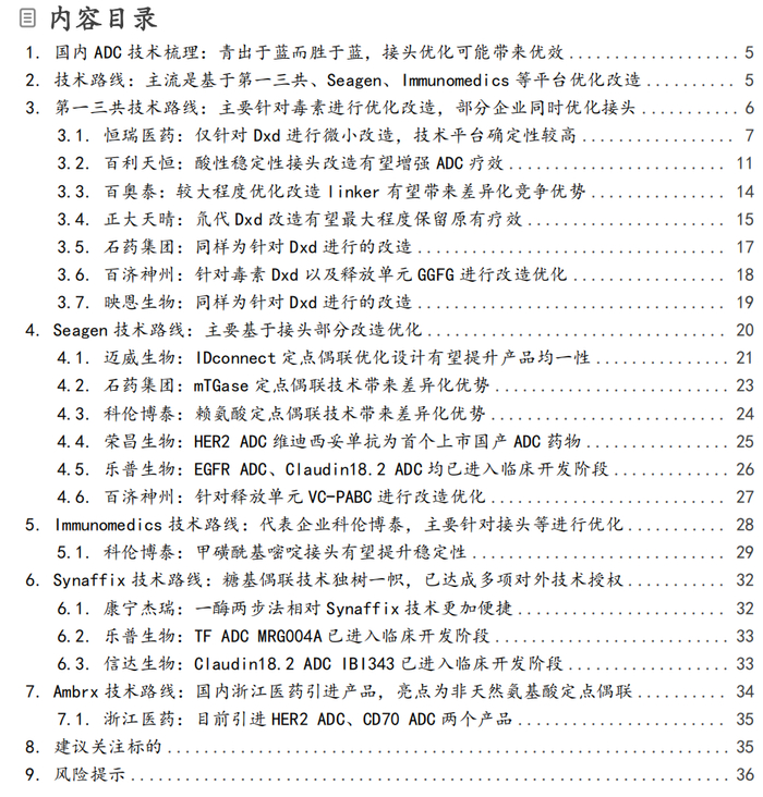 ■核心观点:国内ADC药物竞争格局复杂,清晰且准确地认知相关企业ADC技术有助于挖掘产业投资机会。本报告中我们梳理了国内主要ADC参与企业的技术平台并对相关技术做了清晰明了的解析, 我们发现国内主流的ADC技术主要是基于第一三共、Seagen、Immunomedics等平台进行优化改造而来,但相关优化改造已展现出青出于蓝而胜于蓝的潜力。结合已有ADC药物临床数据,以及基于对ADC药物结构(包含抗体、Linker、Payload)和体内作用方式复杂性的认知,我们认为ADC药物领域并不存在“包打天下”的技术平台,国内相关企业在这一领域的布局存在超预期的可能性。