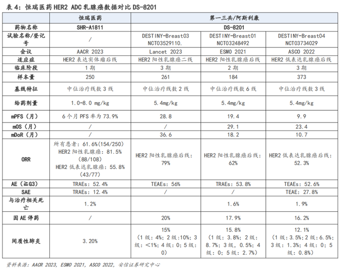 安全性方面:目前DS-8201最受关注的安全性问题为间质性肺炎,而该研究中SHR-A1811在间质性肺炎发生率上表现出较为明显的优势,该研究中间质性肺炎发生率为3.2%;而DS-8201既往在针对HER2阳性乳腺癌后线治疗的DESTINY-Breast01研究中为15.8%、在针对HER2低表达乳腺癌后线治疗的DESTINY-Breast04研究中为12.1%,在针对HER2突变NSCLC后线治疗的DESTINY-Lung01研究中为26.4%。