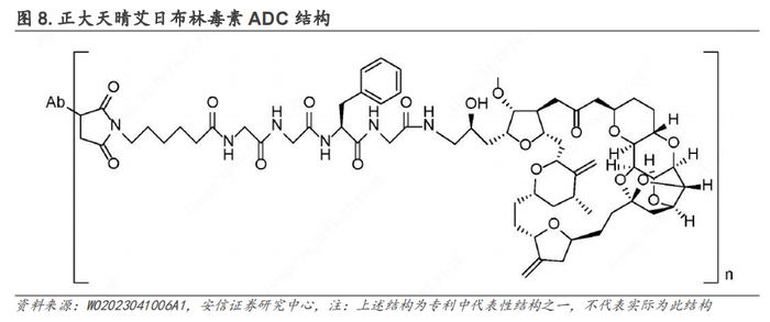 除外上述ADC平台外,根据已公开专利信息,正大天晴还布局了基于艾日布林毒素的ADC药物,艾日布林为天然海洋产物halichondrin B的一种合成类似物,可抑制微管生长期,其通过基于微管蛋白的抗有丝分裂机制发挥作用,导致G2/M细胞周期的停滞、有丝分裂纺锤体的破坏,并最终在长期的有丝分裂阻滞后导致细胞凋亡。