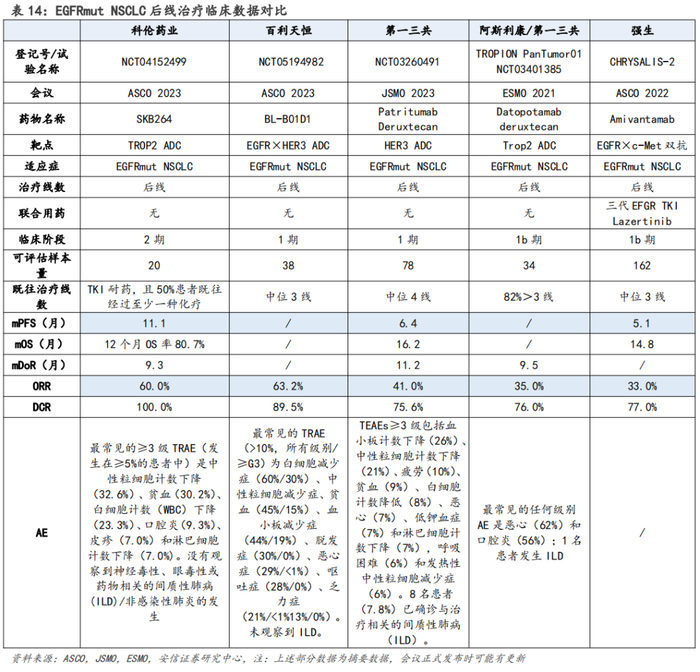 目前科伦博泰已披露了其TROP2 ADC SKB264在NSCLC后线治疗中的临床数据。根据已披露数据,SKB264在20例可评估的EGFRmut NSCLC患者(患者既往经过TKI治疗且耐药,且50%患者既往经过至少一种化疗)的后线治疗中,非头对头对比优于同类药物阿斯利康/第一三共TROP2 ADC Datopotamab deruxtecan、以及第一三共 HER3 ADC Patritumab Deruxtecan、强生EGFR×c-Met双抗Amivantamab。