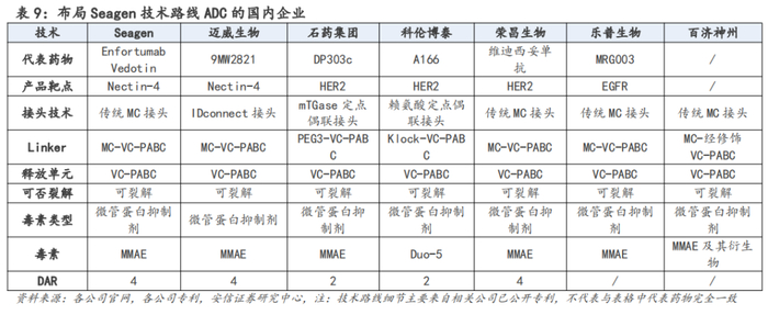 国内以Seagen ADC技术平台为基础进行优化改造的ADC企业,主要有迈威生物、石药集团、科伦博泰、荣昌生物、乐普生物、百济神州等,由于Seagen ADC技术已过专利保护期,部分企业未对相关技术做进一步改造,而部分企业处于更优效设计的考虑对接头做了改造。