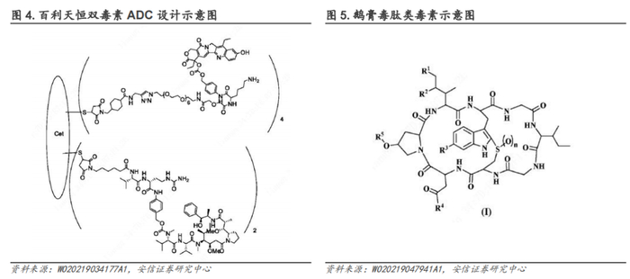 除外上述ADC平台外,根据已公开专利信息,百利天恒还布局了:(1)偶联两种不同毒素的的ADC药物,其中一种毒素可定点偶联至进工程化改造抗体的半胱氨酸,另一种毒素可偶联至链接二硫键断裂后的巯基;(2)以及含新型毒素的鹅膏毒肽类ADC,该毒素是由剧毒蘑菇中分离出来的鹅膏肽类毒素中的一种,可抑制整合RNA聚合酶II和III的转录,导致蛋白质缺失和细胞死亡。