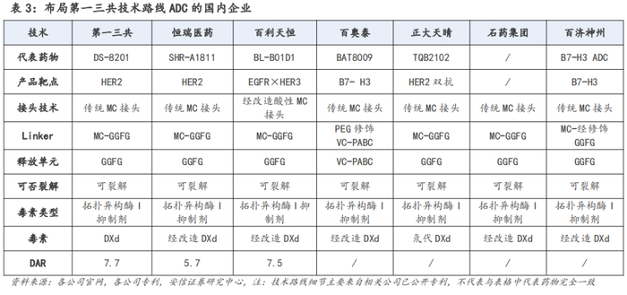 国内以第一三共ADC技术平台为基础进行优化改造的ADC企业,主要有恒瑞医药、百利天恒、百奥泰、正大天晴、百济神州等,其主要针对毒素DXD、接头进行改造。上述国内公司针对毒素DXD、接头等进行优化改造,主要是为了获得可规避专利、稳定性良好、安全性与有效性良好的ADC产品,其中部分产品已披露的临床数据已验证其改造的有效性。