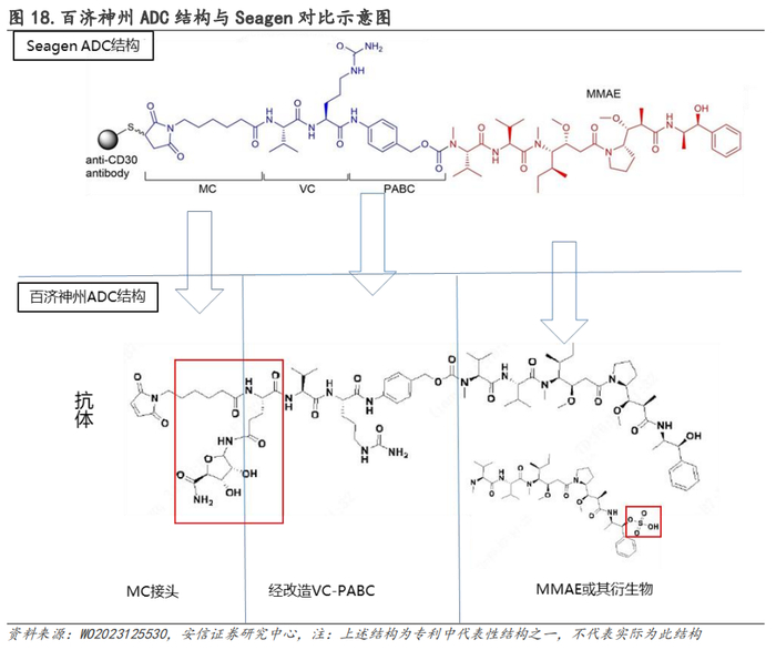 根据百济神州ADC专利,其ADC技术主要针对Seagen技术平台中释放单元VC-PABC以及毒素MMAE进行改造优化。对比来看百济神州ADC与Seagen技术平台ADC药物具有较为相似的结构: