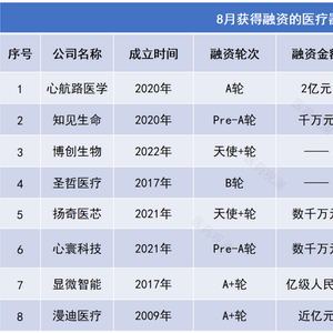除了上述公司,还有其它创新医疗器械公司也在今年8月完成融资,限于篇幅,本文不再一一介绍。希望在资本的助力下,这些公司可以加快创新产品的研发进度,早日为广大患者带来新的治疗选择。