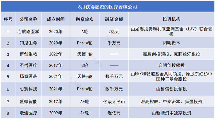 公开资料显示,在刚刚结束的8月份,多家中国医疗器械公司宣布迎来新的融资进展。通过梳理这些公司及其产品管线,我们发现了以下亮点: