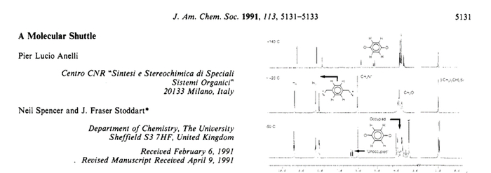 1990年,弗雷泽加入了伯明翰大学(University of Birmingham),担任有机化学教授。一年后,他成功合成出了一种名为轮烷(rotaxane)的分子,这种分子由一个两头大中间细、类似哑铃状的分子穿过一个环状分子组成。以哑铃状分子中间的细杆为轴,环状分子可以在上面来回滑动。此时的弗雷泽尚未意识到,他的“分子机械王国”的首个“零件”已经诞生了。