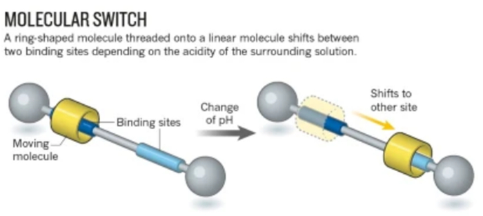 1994年,弗雷泽和他的同事们改进了轮烷的设计,使中间的分子轴上带有两个不同的结合位点,当该分子所处溶液的pH值发生改变时,轴上的环就能从一个结合位点跳跃到另一个结合位点,并且这种跳跃是可逆的。这个天才的设计使纳米尺寸的分子开关或是传感器成为了可能。在弗雷泽的分子开关发明后,更多基于不同控制条件的分子开关相继诞生,这些开关的控制条件可以是光、温度变化、溶液中的特定离子或者分子。