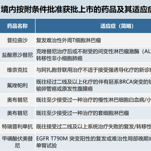 截至2022年9月1日,已有32个化学药品或单抗类生物制品的37个肿瘤适应症在境内获附条件批准上市(见下表)。