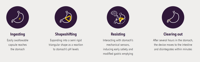 Epitomee Medical的减肥胶囊不会在人体内产生任何化学反应,也不产生任何代谢产物。在胶囊溶解后,里面的颗粒会释放出来遇水膨胀100倍,形成无数个半刚性的三角形小型支架把胃填满,从而产生强烈饱腹感,制止患者摄入更多食物。简单来说,就是与灾荒年间,受灾百姓吃观音土(即常用于止泻的蒙脱石)充饥的原理是一样的,把肚子填满就不饿了。