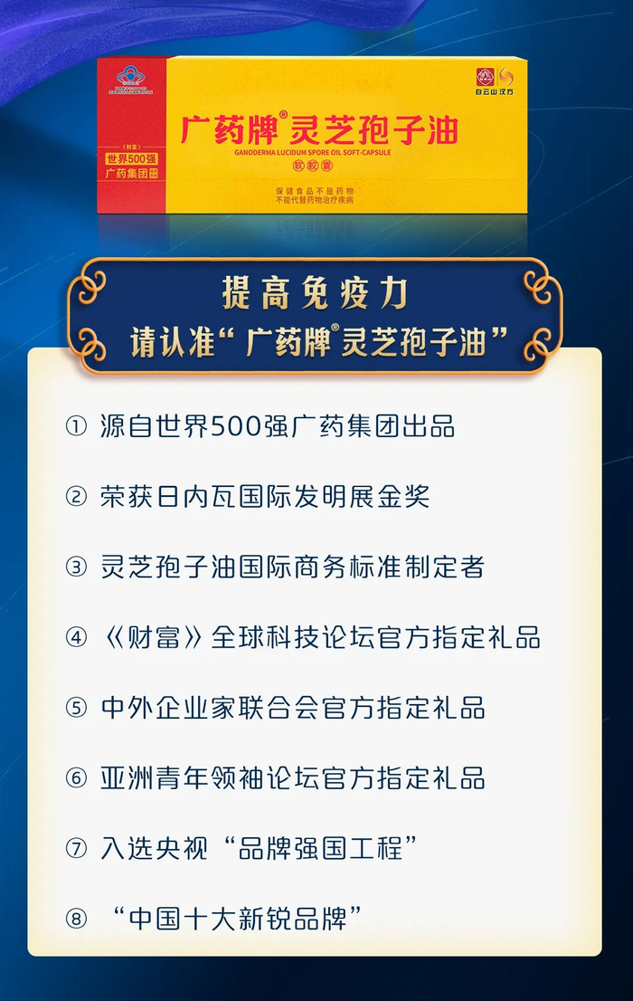 广药牌灵芝孢子油作为白云山汉方潜心多年研发出的“时尚中药”,集十项国家发明专利于一身,是运用国家工程研究中心低温物理破壁和超临界二氧化碳萃取技术,将传统中药灵芝的有效成分萃取浓缩出来,灵芝总三萜化合物、麦角甾醇双效成分协同作用免疫细胞,更具备增强免疫力优势。其增强免疫力的保健功能,已得到经常失眠疲劳、亚健康、体弱年迈、肿瘤术后等免疫力低下人群的广泛认可!