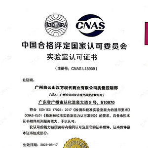 2023年8月25日,广药集团旗下广州白云山汉方现代药业有限公司成功获得中国合格评定国家认可委员会授予的实验室认可证书(注册号CNAS L18909)。这是白云山汉方首个取得CNAS实验室认可的实验室,标志着实验室地位的提升,具备国际认可服务的技术能力。