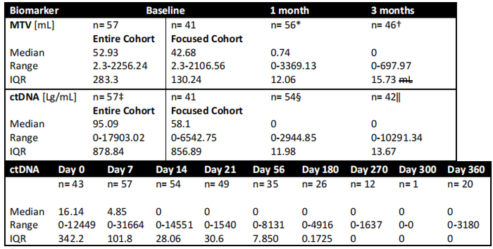 基线和可用的治疗后MTV和ctDNA值见表2。基线(n= 42)时扫描的中位时间为30 min(范围,8-217min),1个月(n= 47)的中位时间为8 min(范围,2-180min),3个月(n= 35)为5 min(范围,2-145min)。每次扫描的时间与基线(rs 0.71,P<0.0001)、1个月(rs 0.81,P<0.0001)和3个月(rs 0.89,P<0.0001)的MTV存在显著相关性[5]。