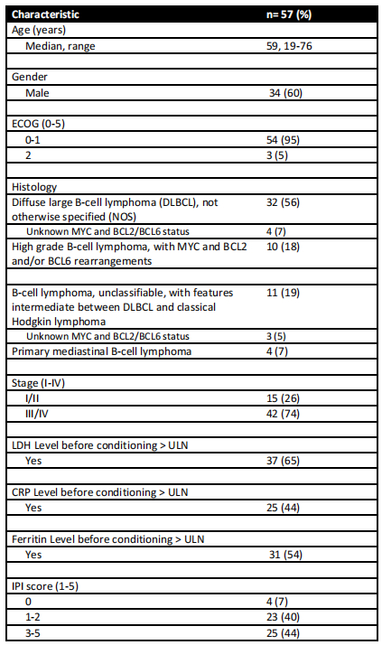 CRES,CAR-T细胞相关脑病综合征;CRP,C反应蛋白;CRS,细胞因子释放综合征;DLBCL,弥漫性大B细胞淋巴瘤;ECOG,美国东部肿瘤协作组体能状态;LDH,乳酸脱氢酶;IPI,国际预后指数;N/A,不适用;NOS,未另行说明;ORR,总体缓解率;ULN,正常值上限